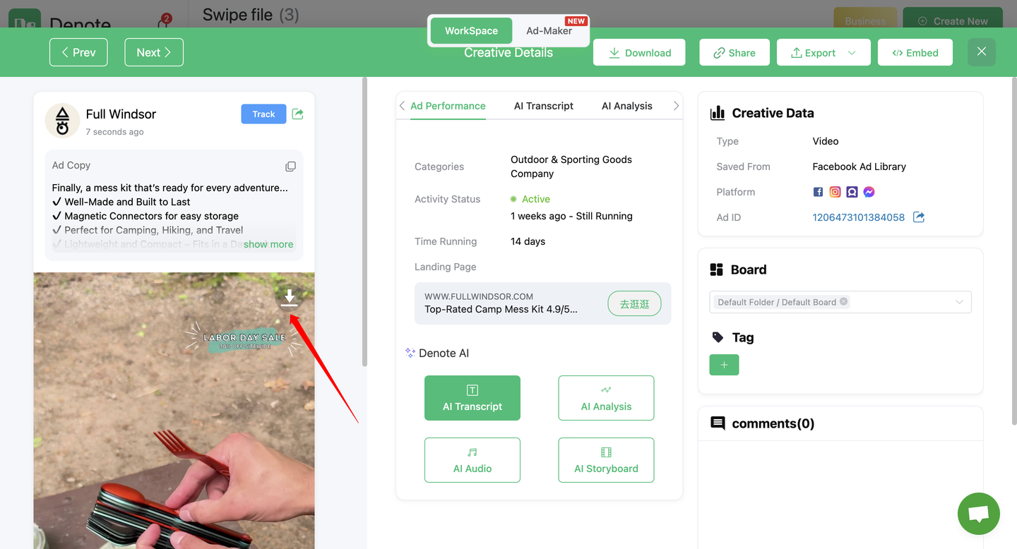 别急着骂,这里的“抄”是科学抄。 ① 先扒广告库:Facebook Ad Library输入关键词,按“活跃度”排序,把最近90天跑最猛的素材全下下来。 ② 建灵感军火库:用Denote插件一键丢链接,视频、文案、落地页全打包,自动去水印,标签打好“瘦身-反转-15s”,30秒完成归档。下次要写脚本,直接搜标签,灵感秒出。