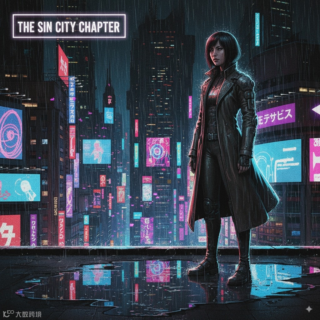 复刻案例:一幅单独的漫画分镜,采用霓虹色的赛博朋克艺术风格。前景中,一名仿佛《攻壳机动队》女主角的亚洲女孩站在摩天大楼的顶层,雨水浸湿她的肩膀。背景里,建筑物上的霓虹招牌与广告牌倒映在水洼中。画面上方有一个标题框,写着“The Sin City Chapter”。灯光强烈,营造出富有戏剧性的未来氛围。