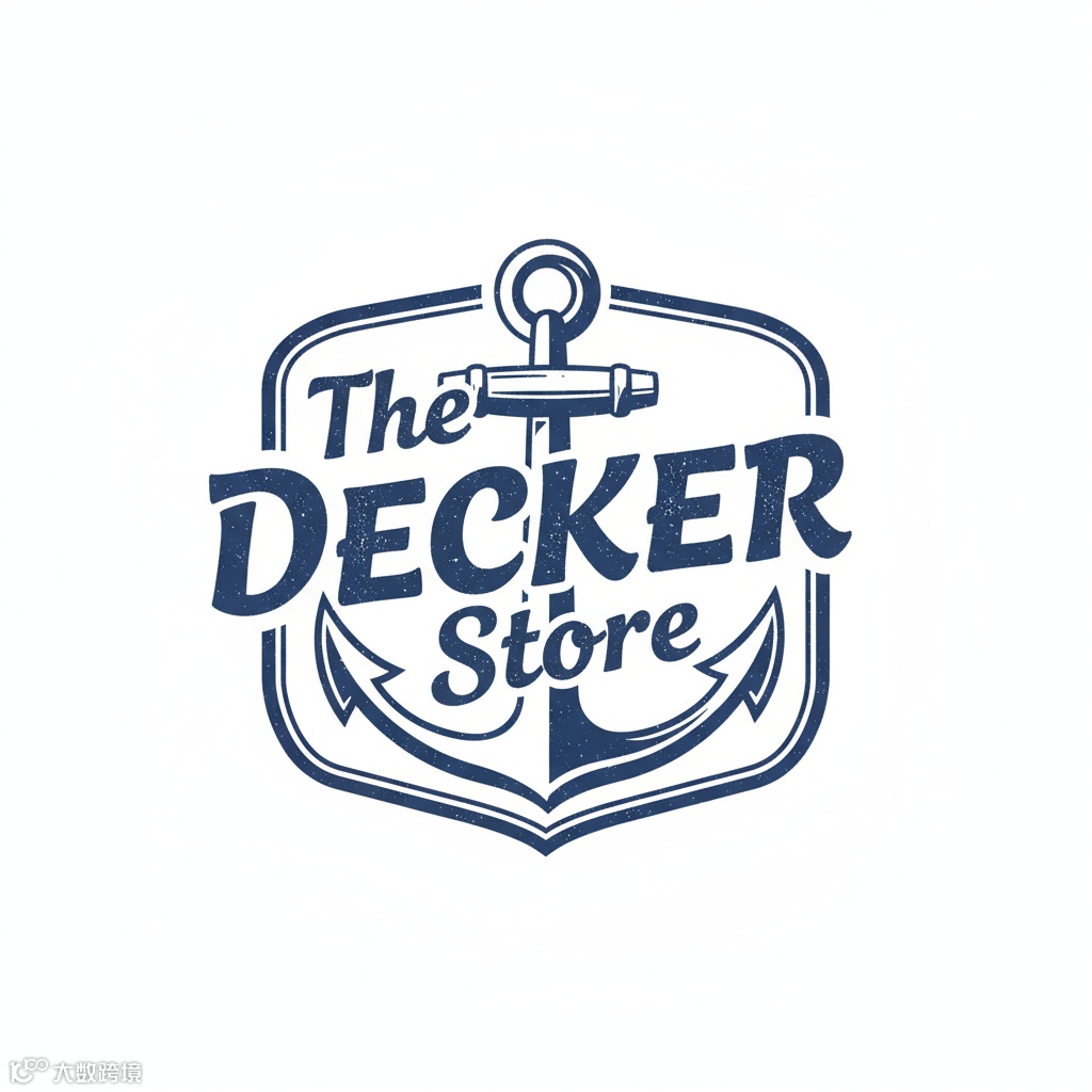 复刻案例:为一家名为“The Decker Store”的复古服装店设计一个复古、老派风格的标志。文字使用复古、粗体、手写式字体。设计中应包含一个锚的图标,并与文字无缝融合。配色方案为蓝色和白色。