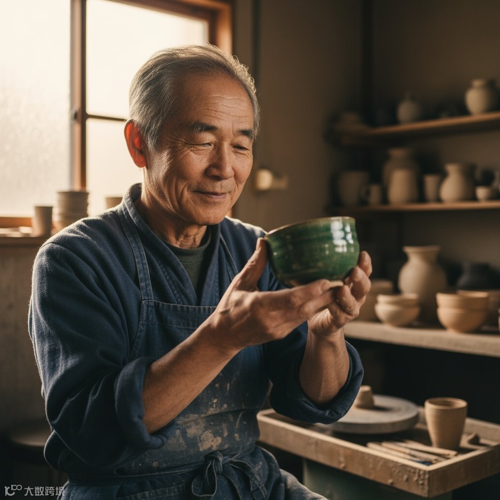 官方案例:一位年长的日本陶艺家的逼真特写肖像,有着深邃的皱纹和温暖、会心的微笑。他正在仔细检查一个刚上釉的茶碗。背景是他质朴的、阳光普照的工作室。场景被柔和的黄金时段光线从窗户照射进来,突出了粘土的细腻纹理。使用85mm人像镜头拍摄,产生柔和、模糊的背景(散景)。整体气氛宁静而精湛。垂直纵向。
