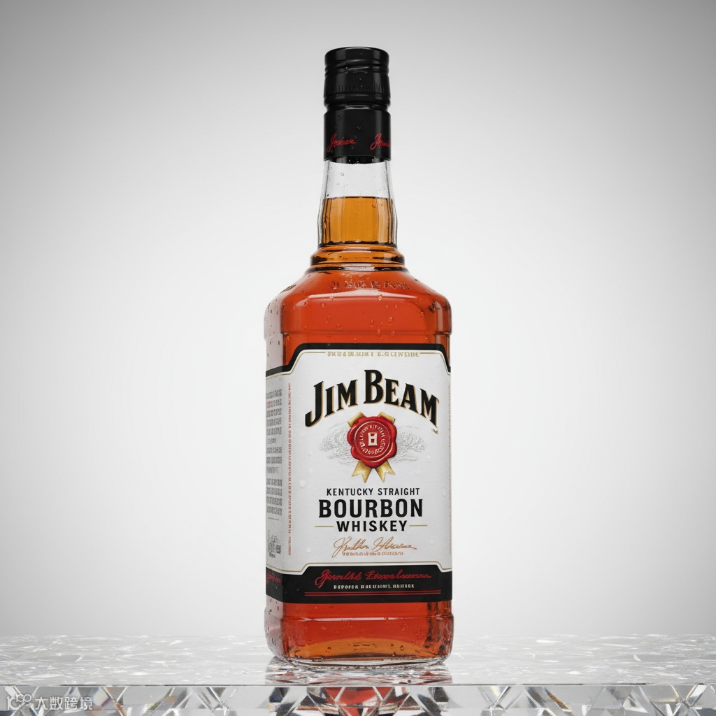 复刻案例:一张高分辨率、摄影棚打光的产品照片,一瓶 Jim Beam 威士忌放置在清澈如水晶般的表面上。灯光采用三点柔光箱布光,以营造柔和的漫射高光并消除生硬的阴影。相机角度为略微抬高的45度视角,以展现瓶身的流畅线条。画面超逼真,瓶身上带有细小的水珠。