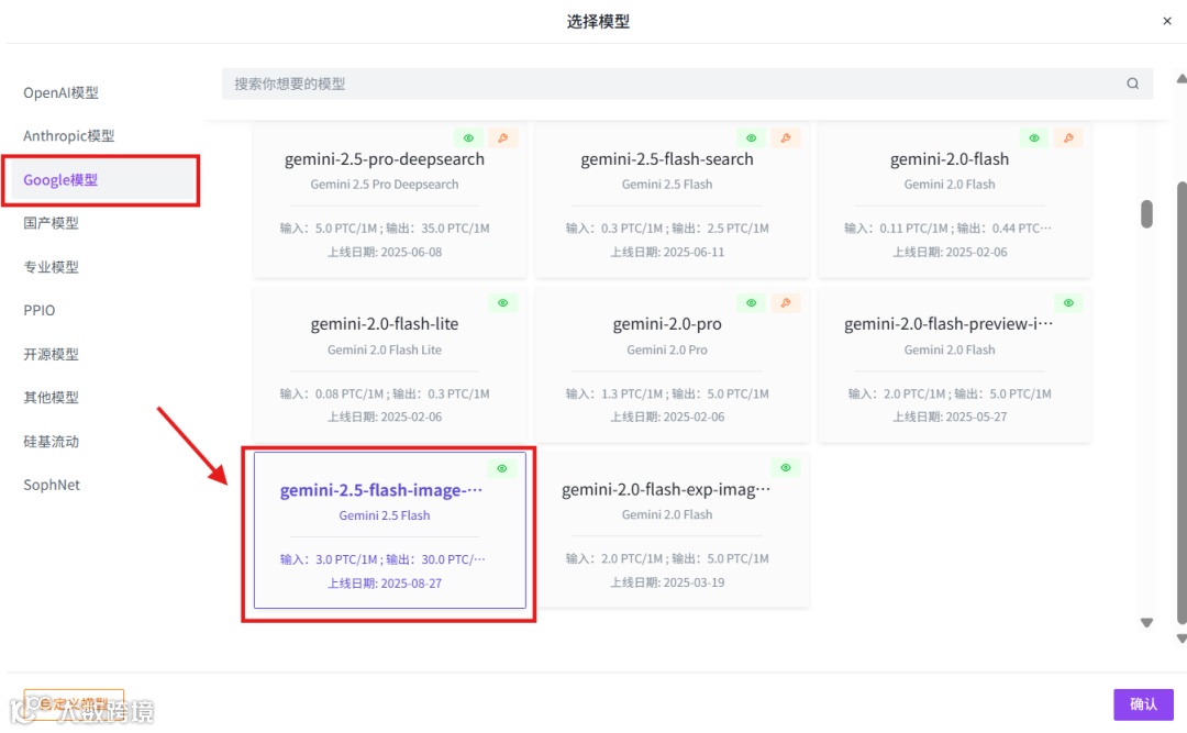 选择模型:Google模型 → gemini-2.5-flash-image-preview → 确认 → 创建