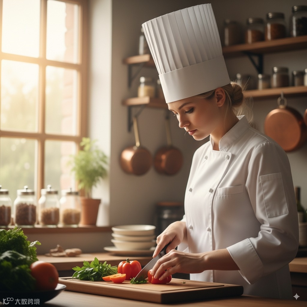 复刻案例:一幅超写实的欧洲年轻金发女厨师半身特写,她戴着高高的白色厨师帽,右手握着厨师刀,专注地在砧板上切新鲜食材。场景位于阳光充足、温馨舒适的家庭厨房,氛围温暖而生活化。画面以50mm人像镜头拍摄,浅景深,背景呈现自然的虚化效果。