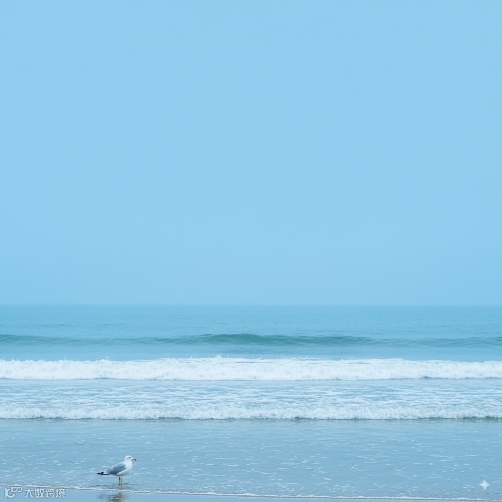复刻案例:一幅极简主义摄影构图,一只孤单的海鸥位于画面左下角。背景是一片辽阔的浅蓝色大海,以白色海浪作为细节,留出大量负空间以便放置文字。