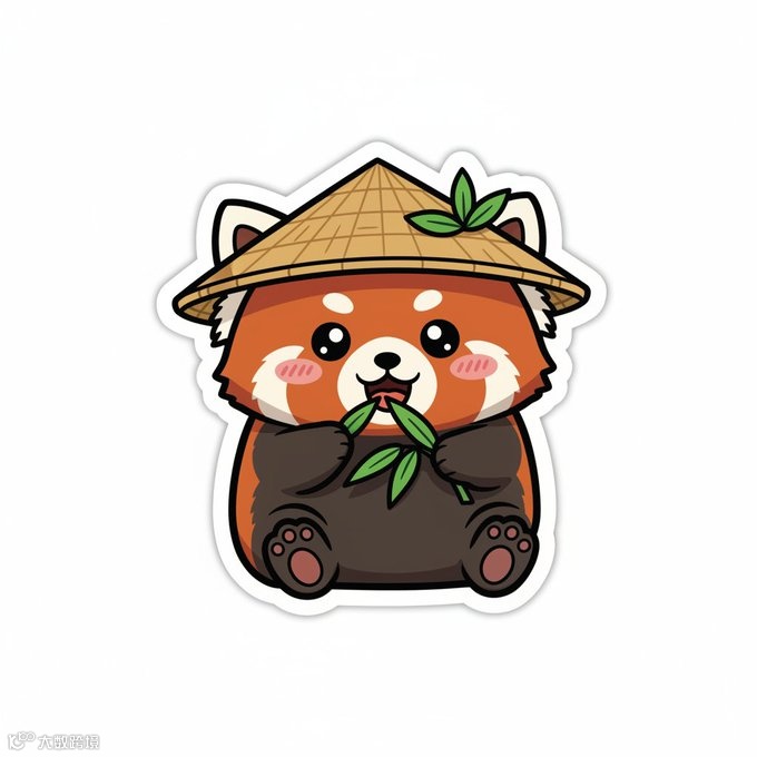 官方案例:卡哇伊风格的贴纸,描绘了一只戴着小竹帽的快乐小熊猫。它正在咀嚼一片绿色的竹叶。该设计具有大胆、简洁的轮廓、简单的卡通阴影和充满活力的调色板。背景必须是白色的。