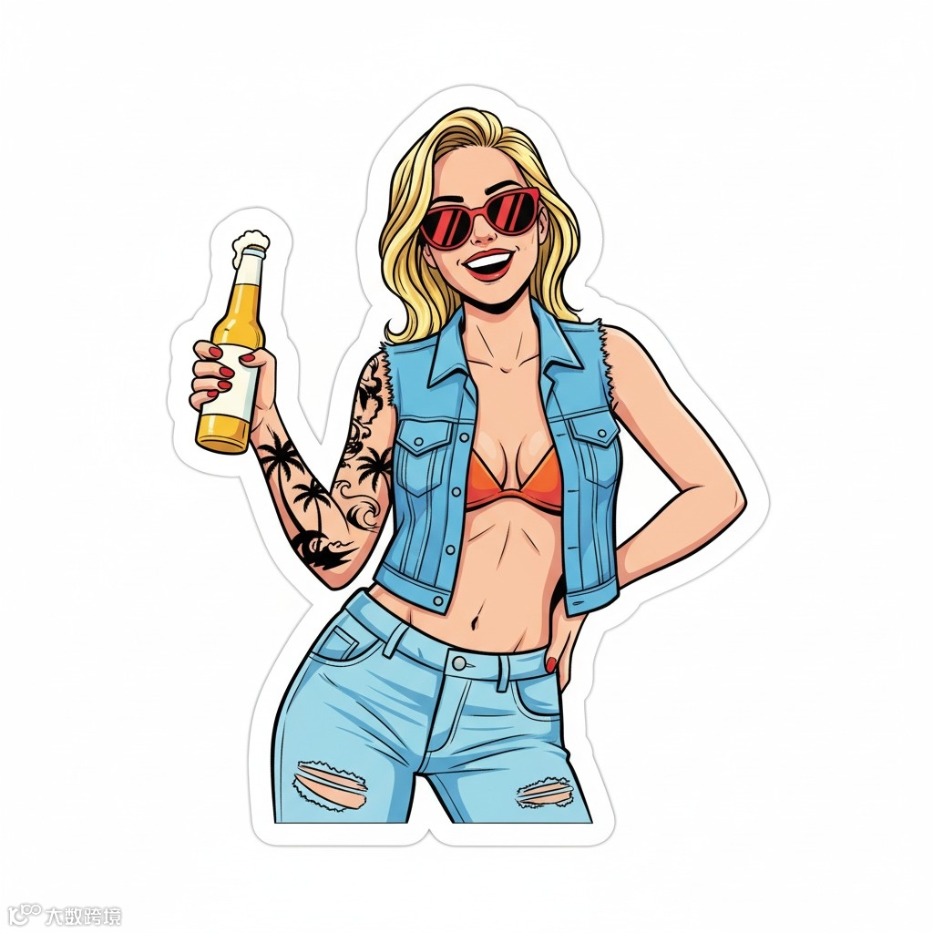 复刻案例:一款侠盗猎车手风格的贴纸,主人公为一位西海岸风格的年轻女性。金发,戴着红色墨镜,面带灿烂笑容,一只手拿着啤酒。她的右臂有纹身。设计采用粗犷清晰的线条、简洁的赛璐璐上色以及鲜明的色彩搭配。背景必须为白色。