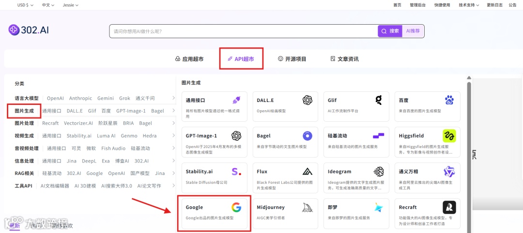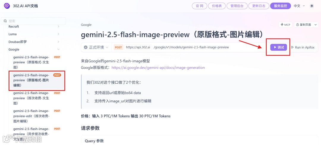 操作路径:API → API超市 → 图片生成 → Google → gemini-2.5-flash-image-preview → 查看文档