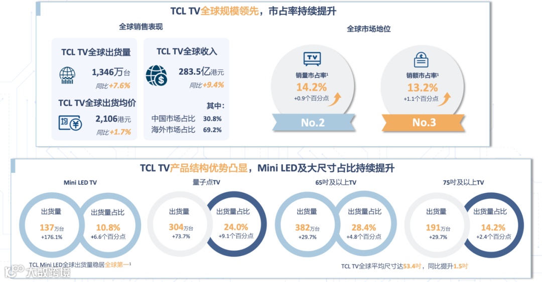 TCL电子顺势而为:全球TV出货量达1346万台,同比增长7.6%,稳居全球前二;Mini LED TV出货量同比大增176.1%至137万台,居全球首位;大尺寸显示业务毛利率提升0.5个百分点至15.9%。