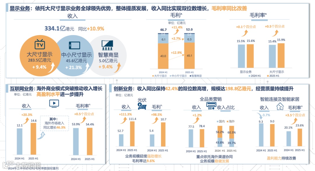 国内市场方面,TCL TV出货量同比增长3.5%,品牌TV出货量增长10.2%,零售量与零售额均居市场前二。Mini LED TV出货量同比飙升154.2%,占比提升至21.2%。国内大尺寸显示业务收入达87.2亿港元,同比增长4.4%,毛利率提升1.7个百分点至19.4%。
