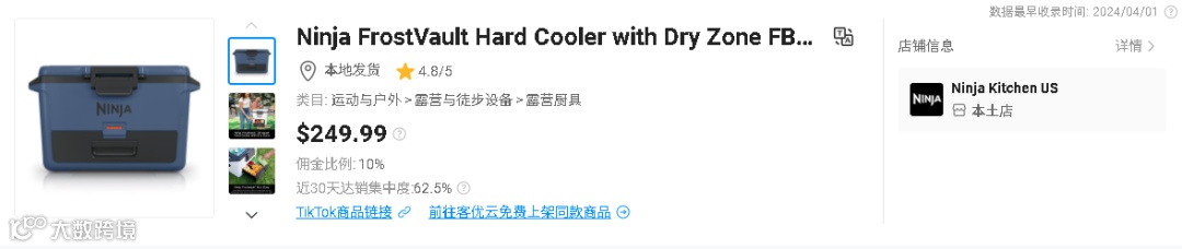 据 Kaladata 平台数据显示,这款定价 249.99 美元的 Ninja 冷藏箱在过去 30 天(8.3—9.1)售出了 1.18 万件,累计成交额达到 282.38 万美金,一举跻身 TikTok 美区 TOP3 热卖榜单以及运动与户外类目第一名的位置。值得注意的是,该款冷藏箱其实早在去年 4 月份就已经上架,但几乎无人问津,迟迟没有出单,直到今年 8 月份中旬品牌开始发力,TikTok 上相关内容爆火后,销量才迎来爆发式增长。