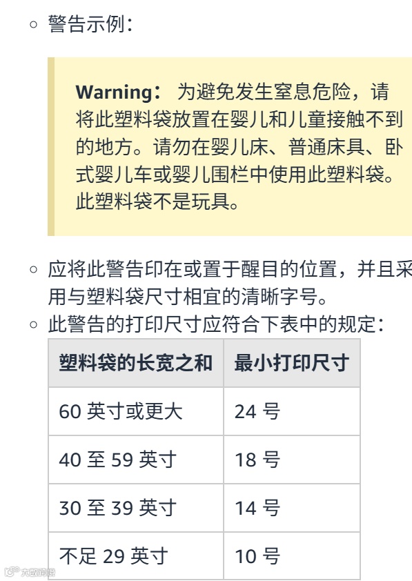如果袋口 ≥ 5 in(12.5 cm),必须贴有窒息警告(Choking Hazard Warning)。