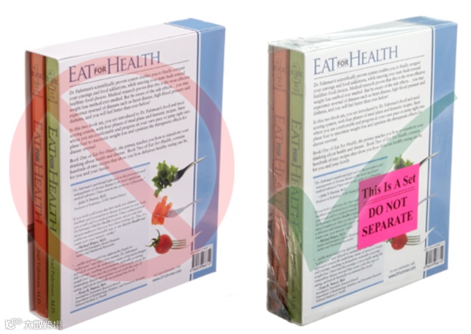 如果产品需要成套销售,必须用包装(如塑封或纸箱)固定在一起,并贴 “Sold as Set” 或 “Do Not Separate” 标签。(示例如下图)