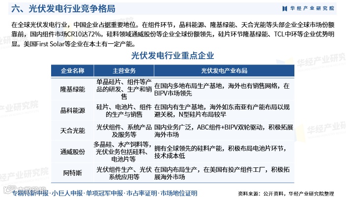 在全球市场中,中国企业占据主导地位。组件环节,晶科能源、隆基绿能、天合光能等企业全球市场份额领先,国内CR10达72%;硅料领域,通威股份等企业具备全球竞争力;硅片环节,隆基绿能、TCL中环优势显著。美国First Solar等企业在本土亦有一定产能布局。