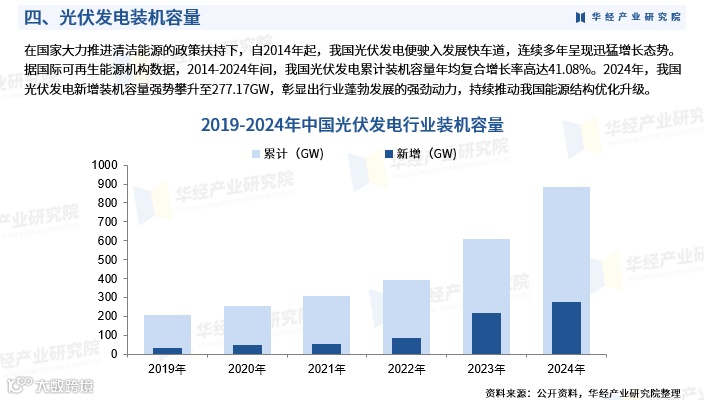 自2014年起,我国光伏产业进入高速发展期。据国际可再生能源机构数据,2014—2024年,我国光伏发电累计装机容量年均复合增长率达41.08%。2024年,新增装机容量攀升至277.17GW,规模位居全球首位。