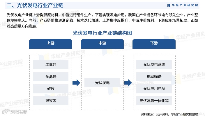 中国光伏发电产业链结构完整,涵盖上游原材料供应、中游组件制造和下游发电应用。近年来,产业整体向高质量发展转型:上游集中度提升,中游注重盈利能力,下游应用场景不断拓展,技术迭代持续加快,产业链价格逐步企稳。