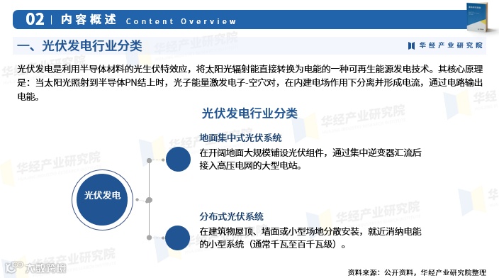 光伏发电是利用半导体材料的光生伏特效应,将太阳光能直接转化为电能的可再生能源技术。其核心原理为:太阳光照射半导体PN结时,光子激发电子-空穴对,在内建电场作用下分离形成电流,通过电路输出电能。