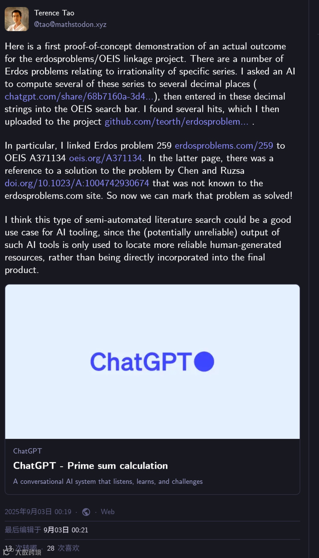 陶哲轩利用GPT-5将特定级数展开为高精度小数,并将结果输入OEIS数据库进行匹配。最终发现,Erdős问题#259与OEIS数列A371134完全匹配。