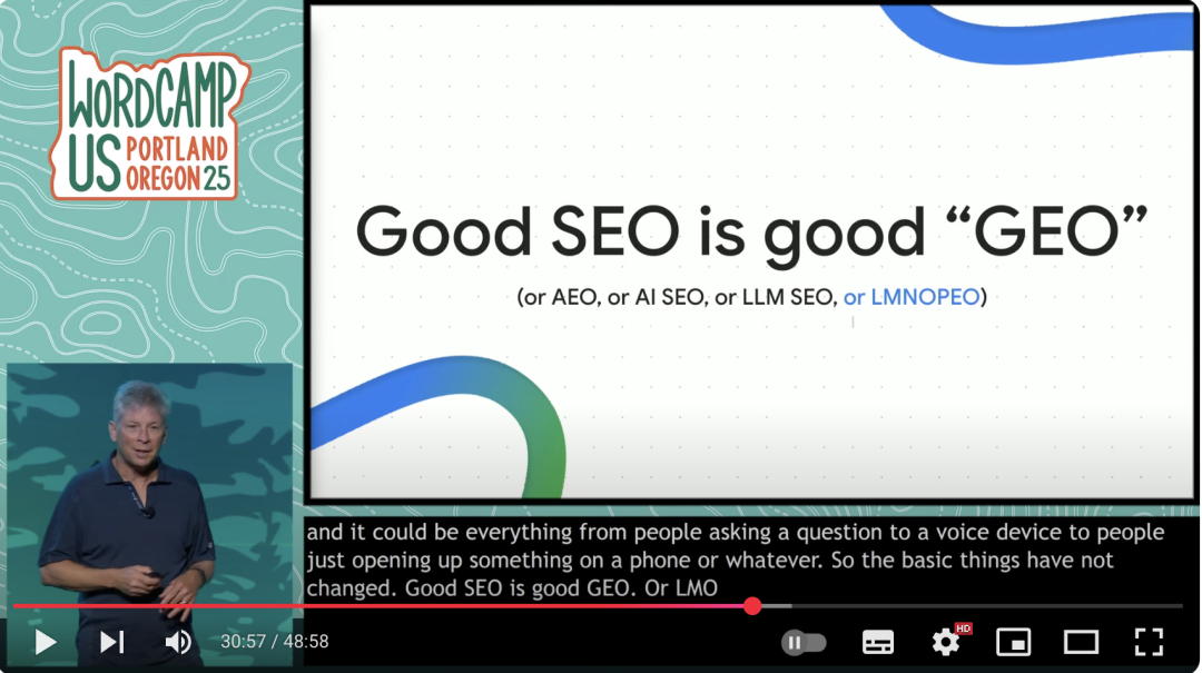 这个视频记录了 Danny Sullivan 在 WordCamp US 2025 的演讲:"How (and why!) Google Search Keeps Evolving"。