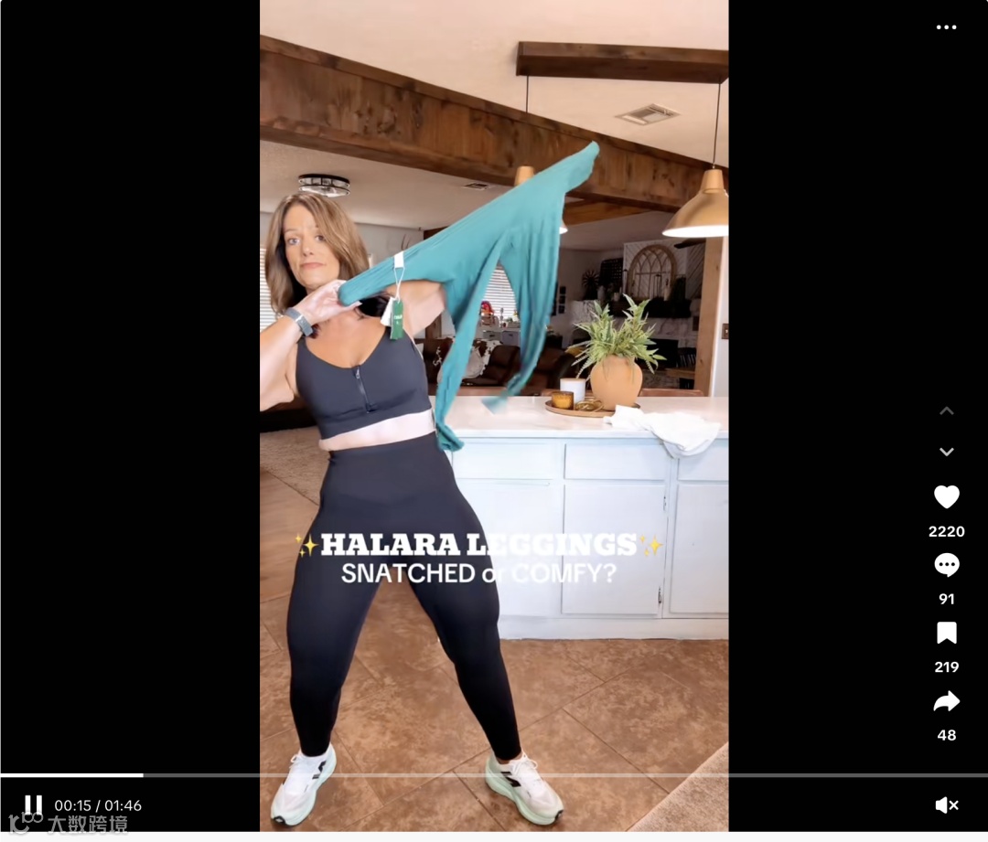 在与Halara的合作案例中,这种影响力得到了充分体现。她曾发布过一条名为《Essential Guide to Choosing Halara Leggings》的短视频,内容围绕如何挑选Halara品牌的不同款式紧身裤展开。