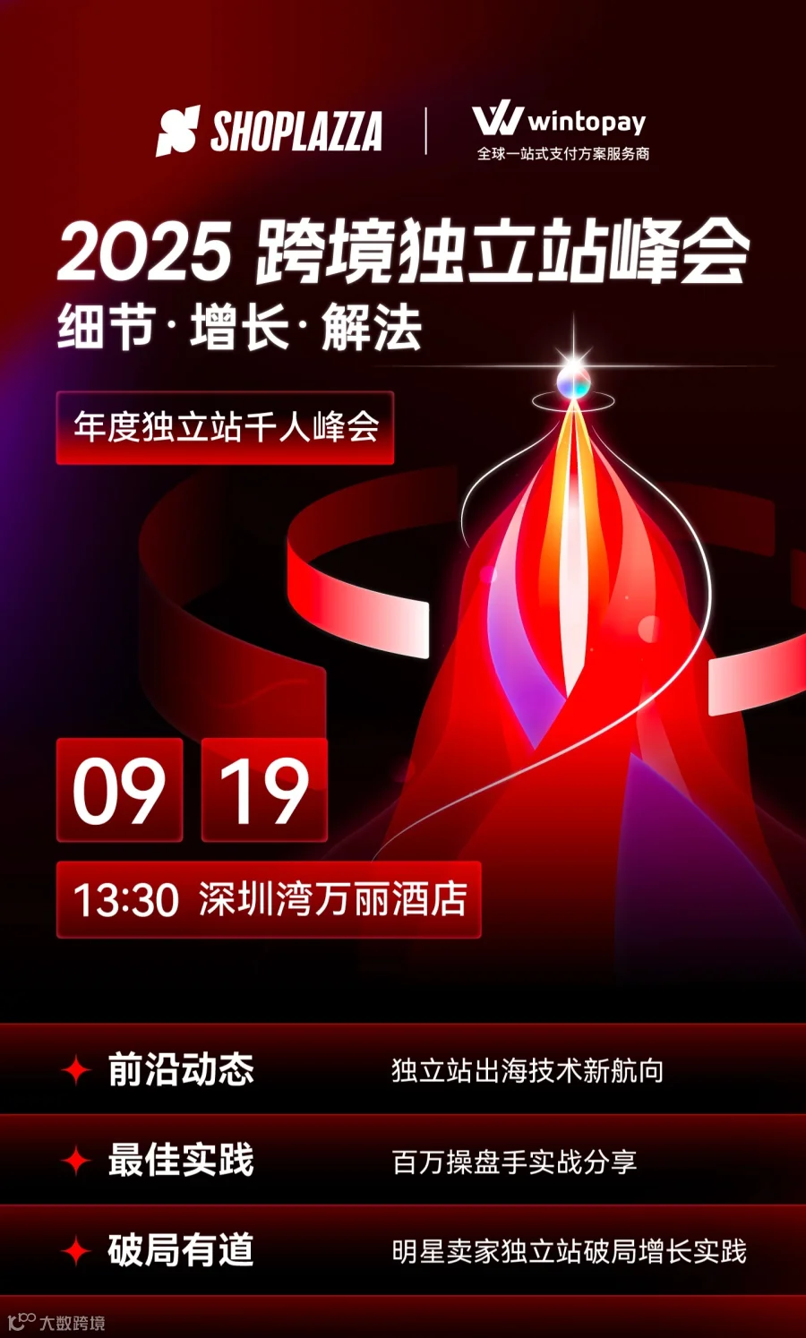 在此背景下, 由店匠Shoplazza、TikTok For Business 主办,WINTOPAY 等行业合作伙伴协办的2025 跨境独立站峰会将于9月19日在深圳万丽酒店举行,本次峰会将聚焦跨境电商旺季前的系统性增长课题,面向商家、服务商与独立站生态,搭建一场连接经验、洞察与方法的深度对话。