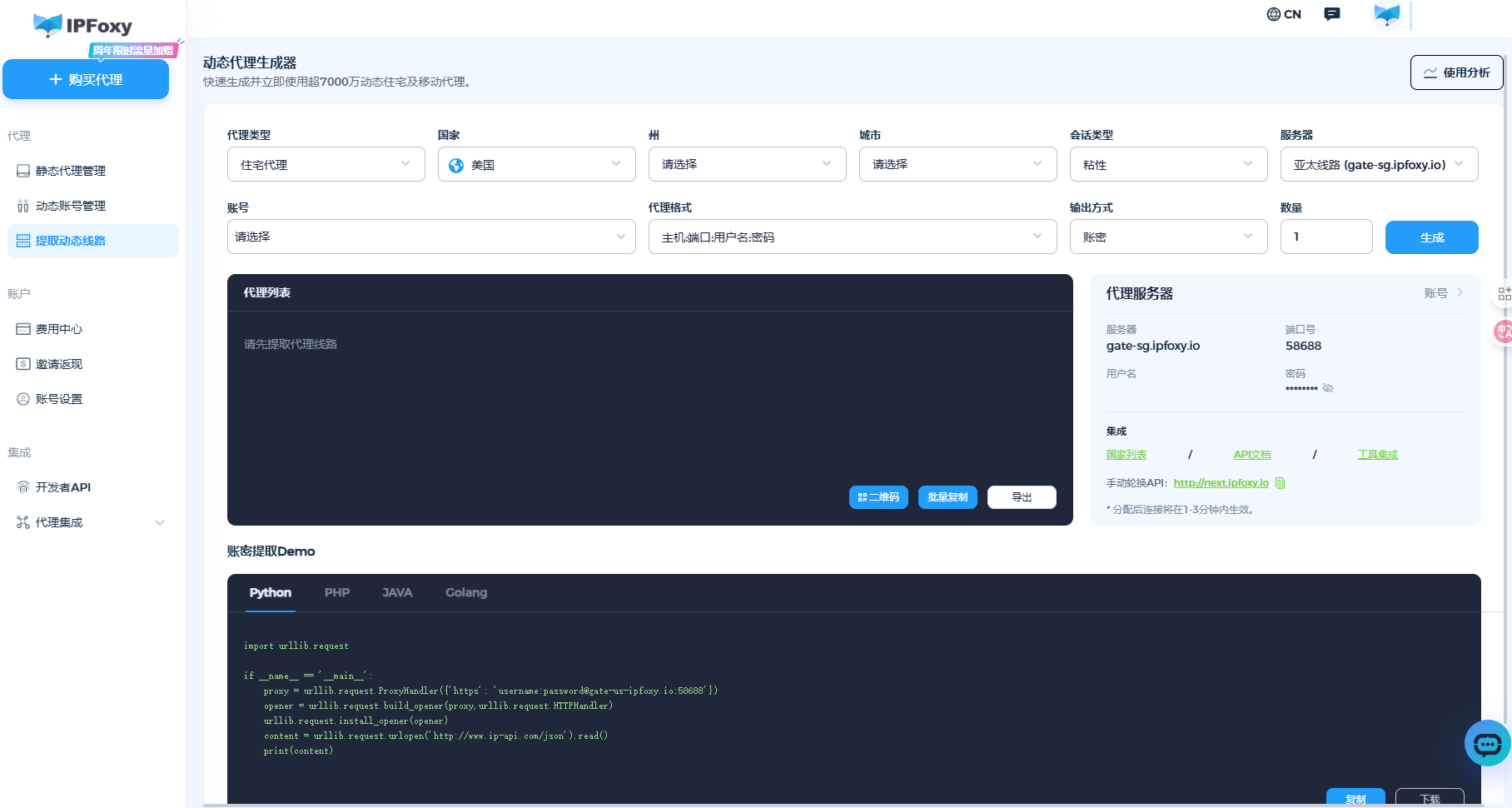 解决方案:这里推荐IPFoxy提供的IP动态代理IP服务,提供更纯净的高质量IP,保证数据采集的连续性和完整性,不会因为访问受限而反复重试。IPFoxy的动态代理支持“全球混播模式”,能够获取不同地区的数据资源,并且能适配爬虫和数据采集的脚本,IPFoxy能无缝配置,直接配合脚本运行,更高效。