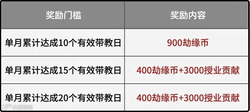 单月内进行统计,累计达成一定次数的有效带教日可获得劫缘币及授业贡献。