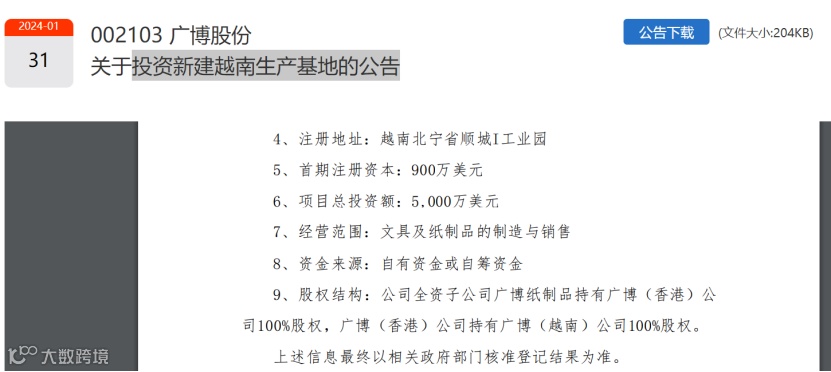 除了得力,另一家中资企业广博股份也在加大对越南的投资力度。2024年初,广博宣布计划通过子公司投资5000万美元(约3.55亿元人民币)新建越南生产基地,以满足复杂外贸环境下客户对供应链弹性的需求[7]。