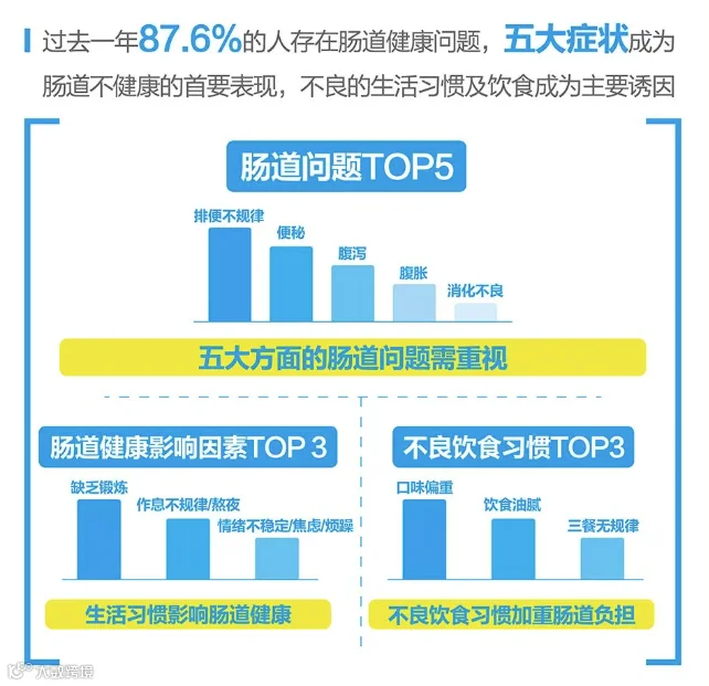 像Echo这样的困扰并非个例。《国人肠道健康2020年报告》显示,87.6%的国人遇到过肠道健康问题,前五大肠道问题分别是排便不规律、便秘、腹泻、腹胀和消化不良。