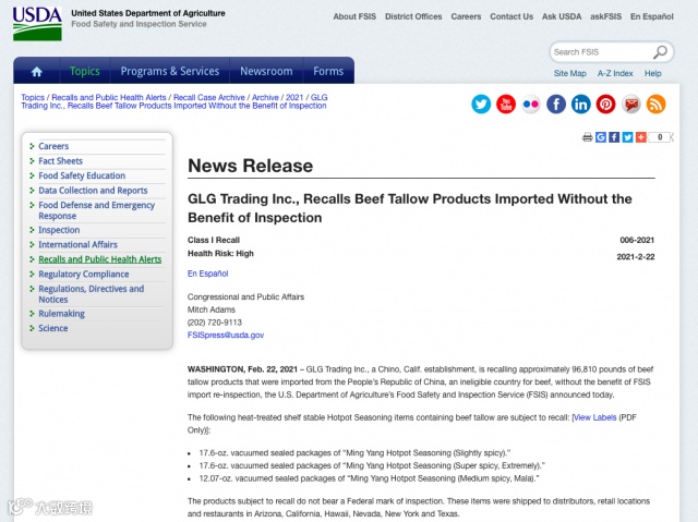 根据美国食品安全检查局(FSIS),此次召回原因在于火锅底料中使用的牛油未经过官方检验,且产品缺少联邦检查标记。