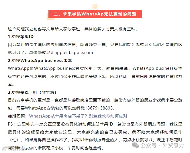 目前苹果手机WhatsApp无法更新问题的解决方案是有这几个,这个问题我之前也写文章给大家分享过,大家可以自行参考我之前分享的文章。