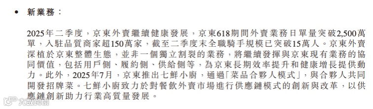 2025年,京东切入外卖市场并实现突破。Q2财报显示,京东外卖已覆盖全国350城,日单量突破2500万单,近200个餐饮品牌销量破百万。