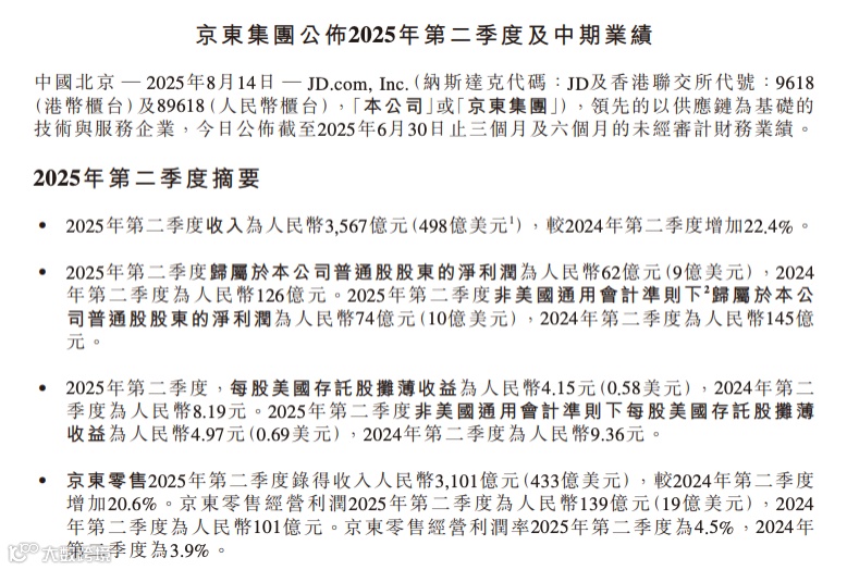 2025年8月14日,京东发布2025年第二季度财报:营收达3567亿元,同比增长22.4%,增速创近三年新高;归属于普通股股东的净利润为62亿元。