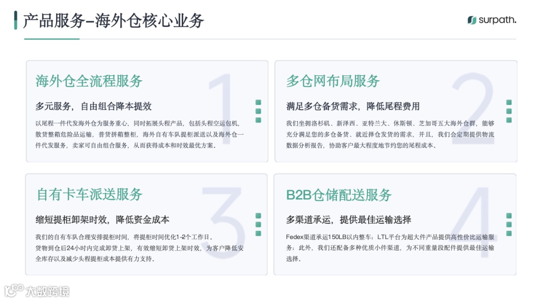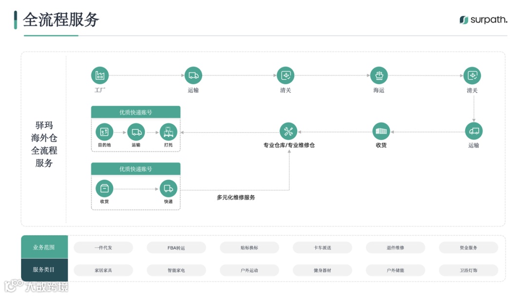 深耕中大件出海领域的专业海外仓服务商,提供以尾程一件代发为核心的全流程解决方案,涵盖头程空运包机、散货拼箱、整柜运输、海外车队提柜派送及海外仓代发等服务,支持灵活组合,助力企业实现成本与时效最优平衡。
