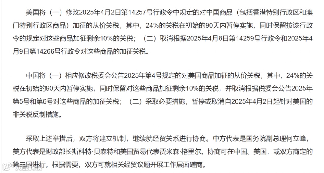 日内瓦经贸会谈达成阶段性成果,双方暂停加征高额关税,释放贸易缓和信号