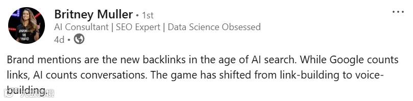 “在AI搜索时代,品牌提及就是新的外链。谷歌统计链接,AI统计对话。”——Britney Muller