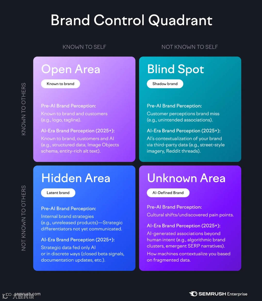 AI无需外链理解品牌权威,它通过语境像人类一样认知品牌。Johari Window模型原用于人际沟通中的自我认知,现可转化为品牌战略控制面板,揭示企业在AI语境下的认知偏差。