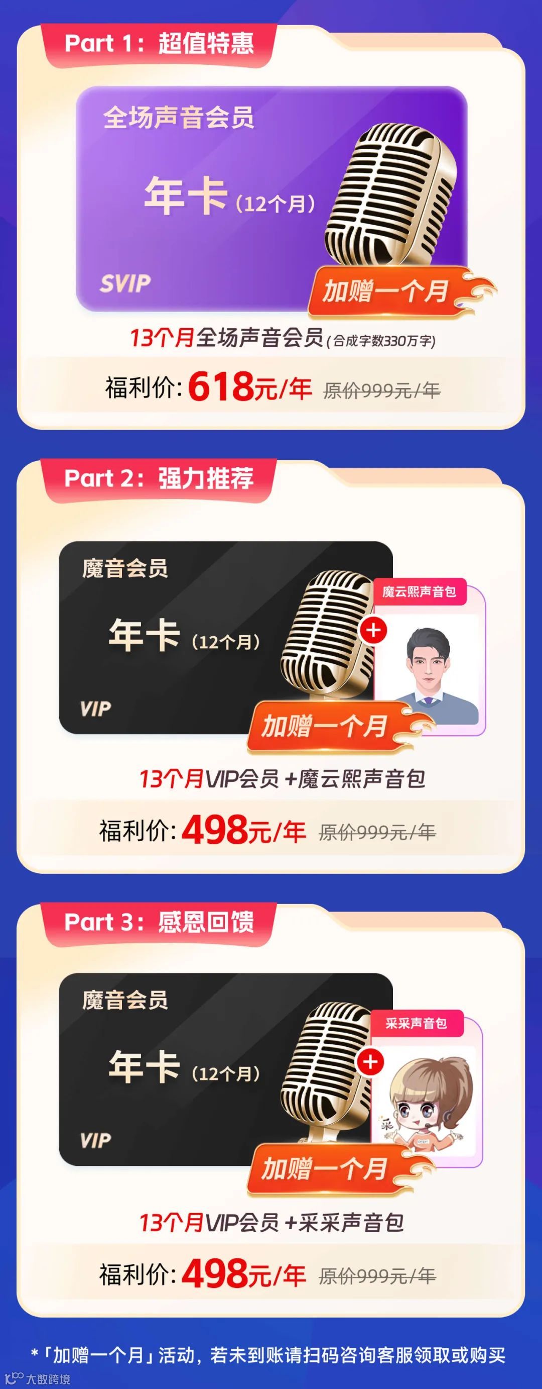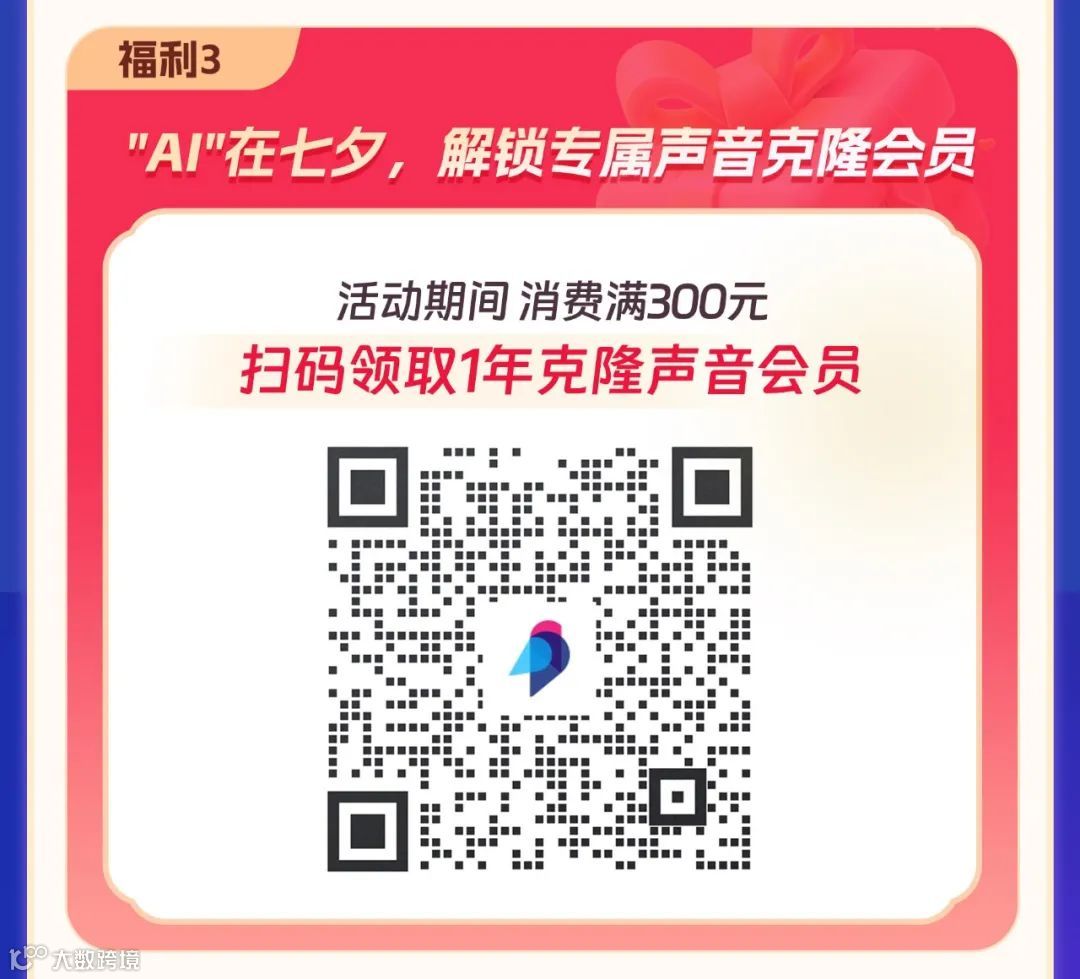 8月27日—9月25日,多重AI声音福利上线,新人0元享SVIP,满300元赠专属声音克隆服务
