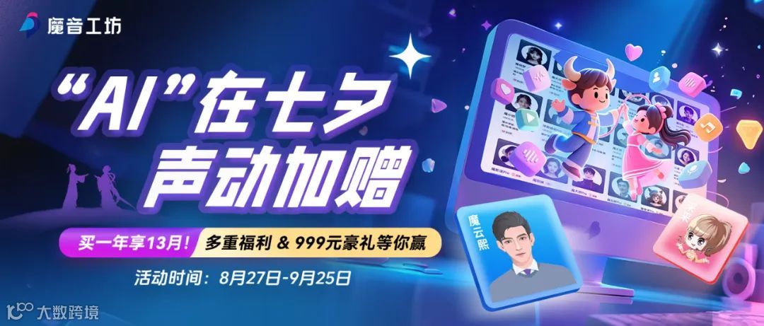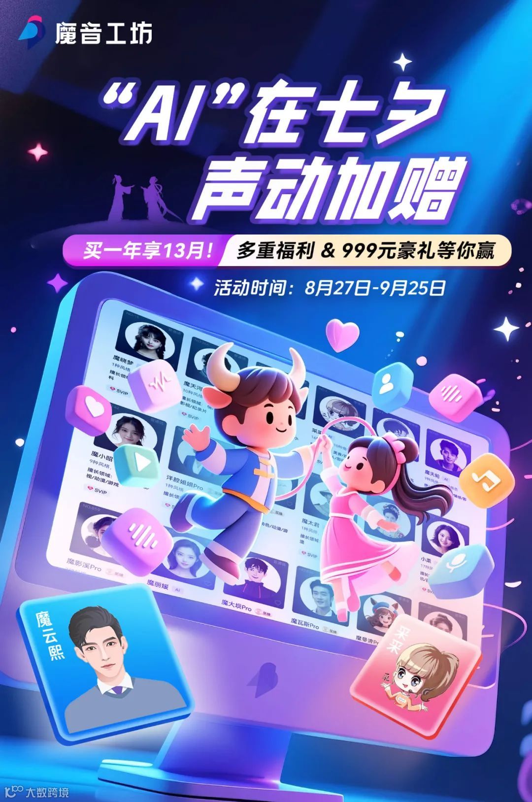 魔音七夕特别活动正式开启,2025年8月27日至9月25日期间,推出为期一个月的“声动七夕”福利盛宴。活动期间,用户购买一年会员可享13个月超值加赠,下单满300元更可获得专属声音克隆会员服务,数量有限,先到先得。