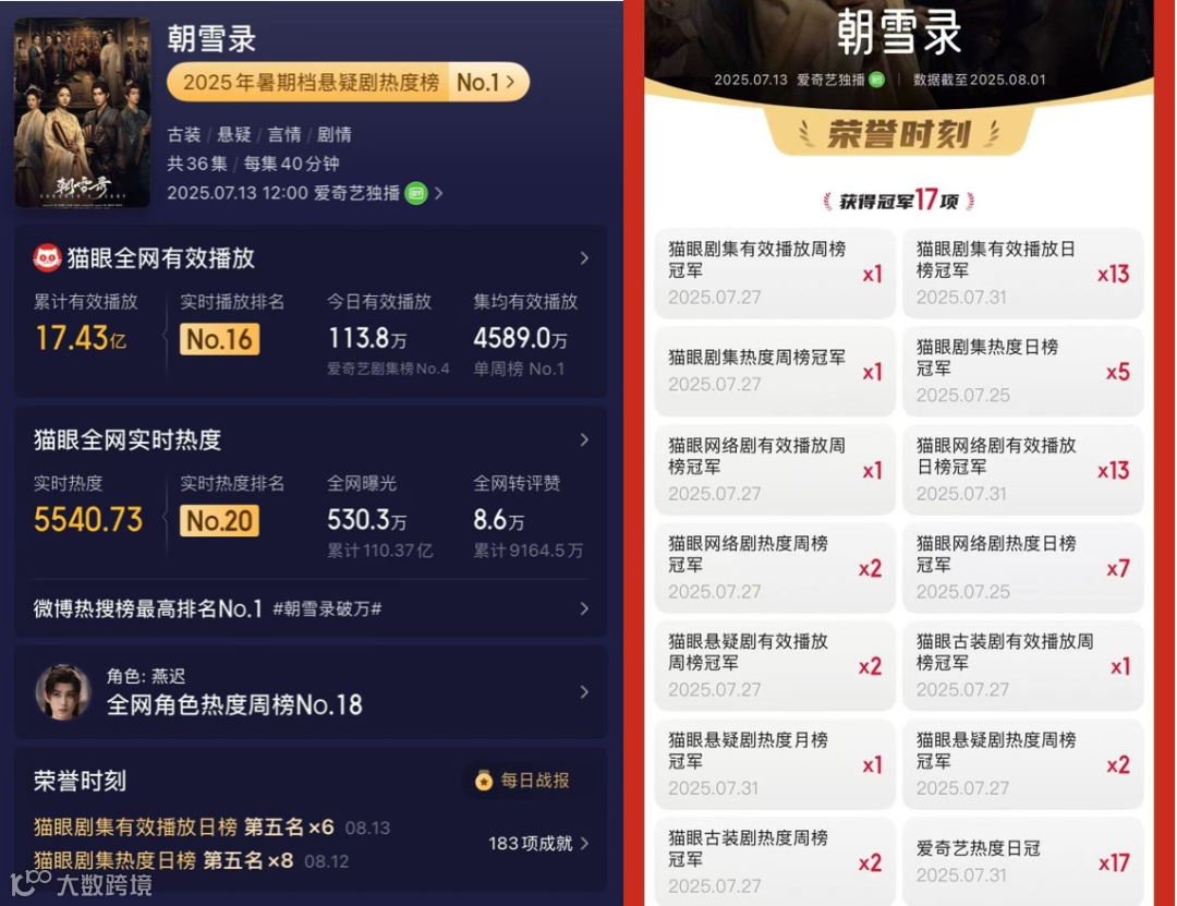 《朝雪录》开创“古装+悬疑”复合模式,融合甜虐情感与探案元素,成暑期档最大黑马:单日市占率达32.4%,单日播放量破7000万,累计播放超17亿。“剧情反转”“李兰迪演技”等话题频登热搜,强情节激发追剧热情。