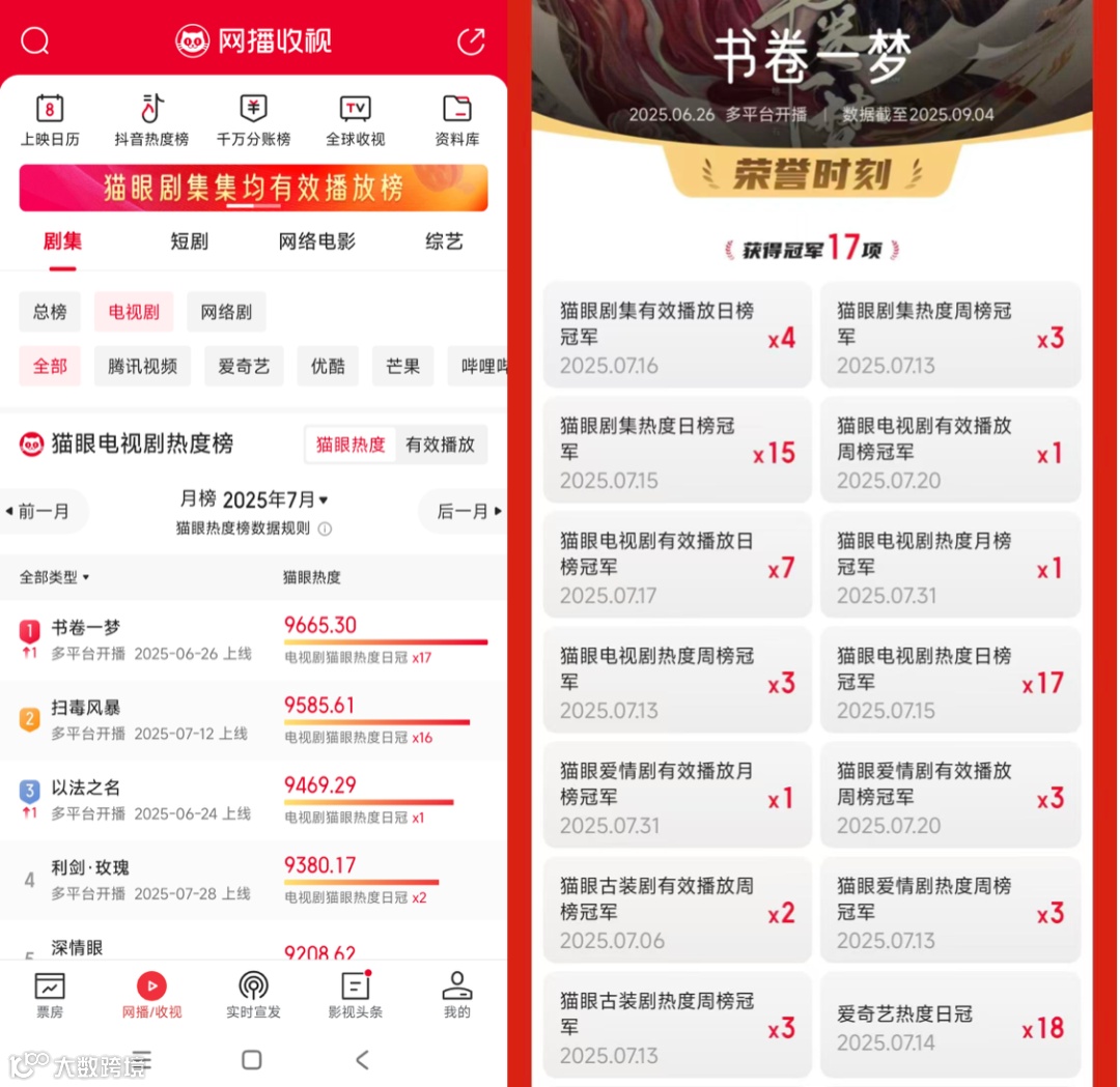 在现实题材破圈的同时,爱奇艺于古装赛道展现精准布局,以《临江仙》《书卷一梦》《朝雪录》形成热度接力,实现暑期档内容的平稳过渡与持续引流。
