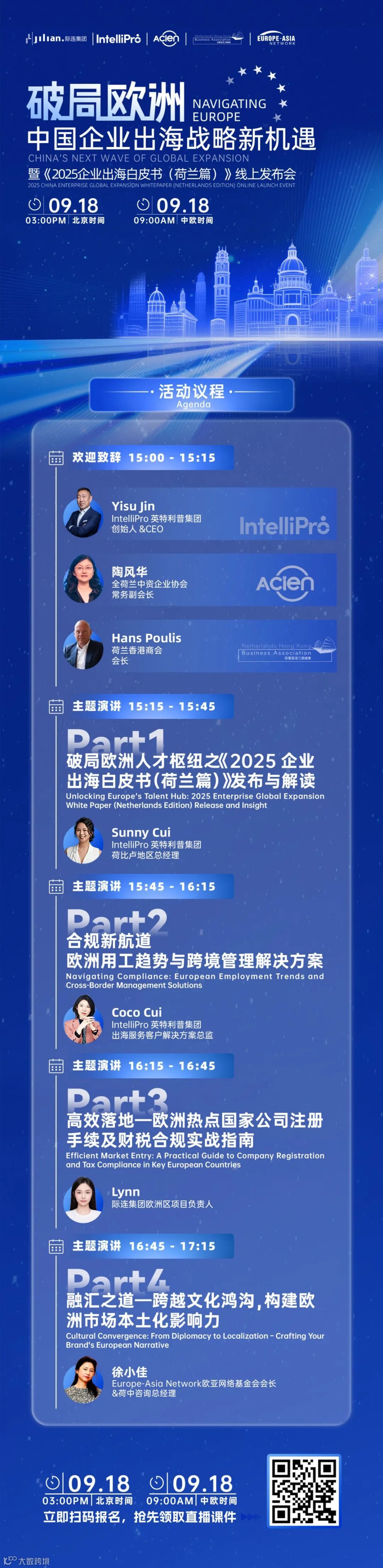 由IntelliPro英特利普集团主办、际连集团联合举办的“破局欧洲:中国企业出海战略新机遇暨《2025企业出海白皮书(荷兰篇)》线上发布会”将于2025年9月18日举行。本次发布会特邀荷兰香港商会会长Hans Poulis等业内专家,深入解析中国企业进入欧洲市场的战略机遇。