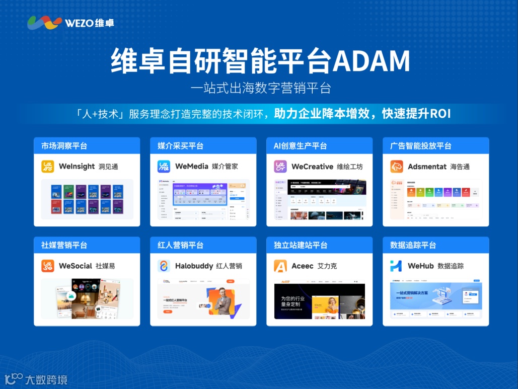 依托维卓多年数据化转型积累的大中台能力,ADAM深度聚焦中国企业全球化营销需求,以智能算法为驱动,提供涵盖“数据洞察-媒介采购-智能投放-内容生产-效果优化”的全链路闭环解决方案,助力企业构建可持续增长的全球化营销体系。