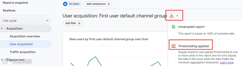 当标准报告中出现红色感叹号并提示“应用了阈值”,说明在启用Google信号的情况下,因特定时间段内用户数量较少,GA4为保护隐私未展示部分数据。例如,流量较少的默认渠道分组可能被隐藏。