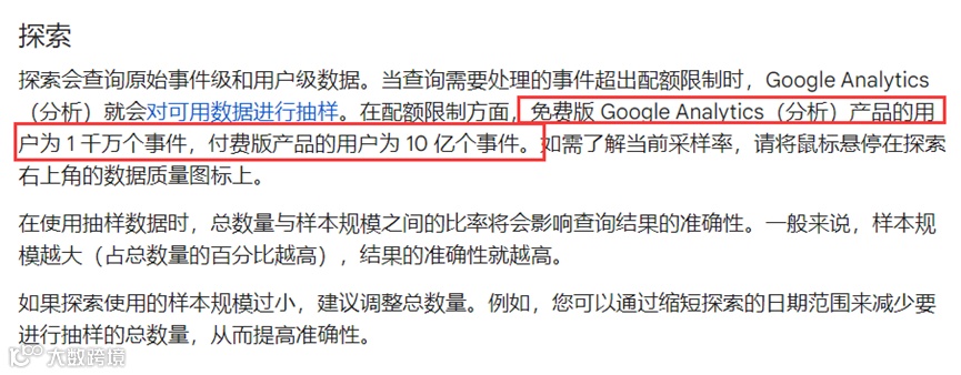 GA4标准报告不进行数据抽样,但“探索”模块中的自定义报告在超出配额时会自动抽样:免费版超过1000万事件、付费版超过10亿事件即触发抽样。抽样状态下数据代表性下降,影响分析准确性。