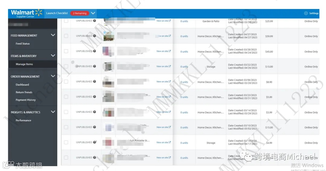 Walmart 现号信息:DSV/1P供应商渠道,涵盖室内户外家具、装饰及灯饰类目。