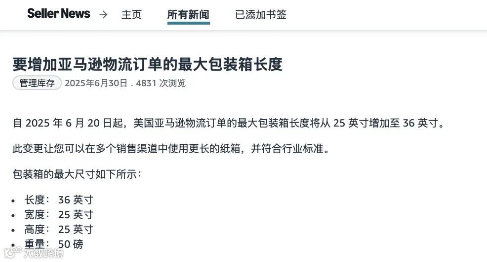 近日,亚马逊更新美国站FBA物流政策,自2025年6月20日起,FBA订单的最大包装箱长度由25英寸(约65.5厘米)放宽至36英寸(约91.4厘米),为大件商品卖家带来显著利好。