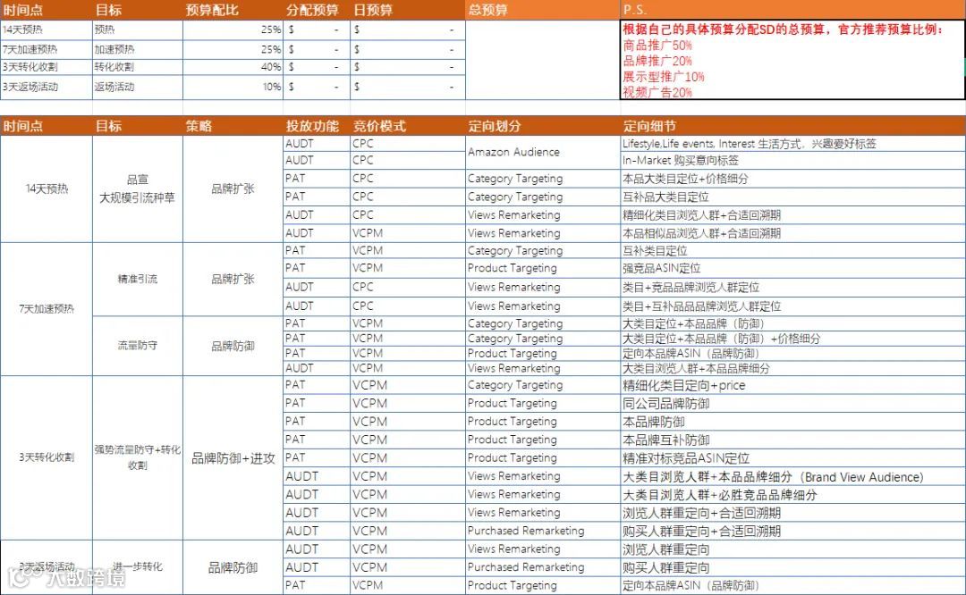 具体策略可以参考下表(具体策略要根据自己产品实际情况来选择,如果有投DSP的话建议再跟投放去商量一下跟SD的配合和预算分配)