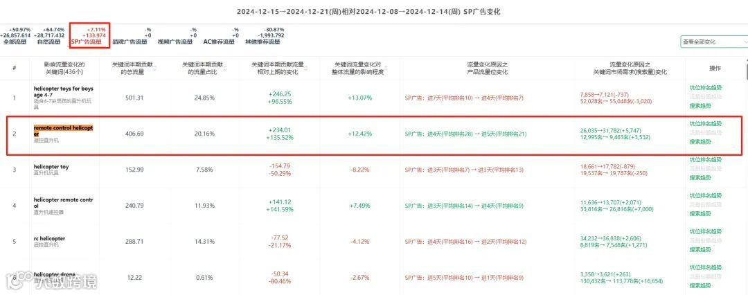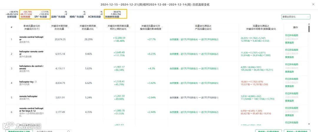 ➡️对比不同时期高流量关键词的变化,识别新趋势或竞品冲击。对比同一个词的在各种流量中的占比,优化广告预算