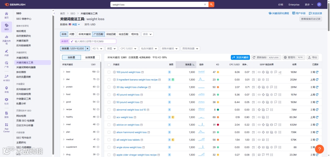 以健康领域为例,输入种子关键词 "weight loss",筛选标准如下: