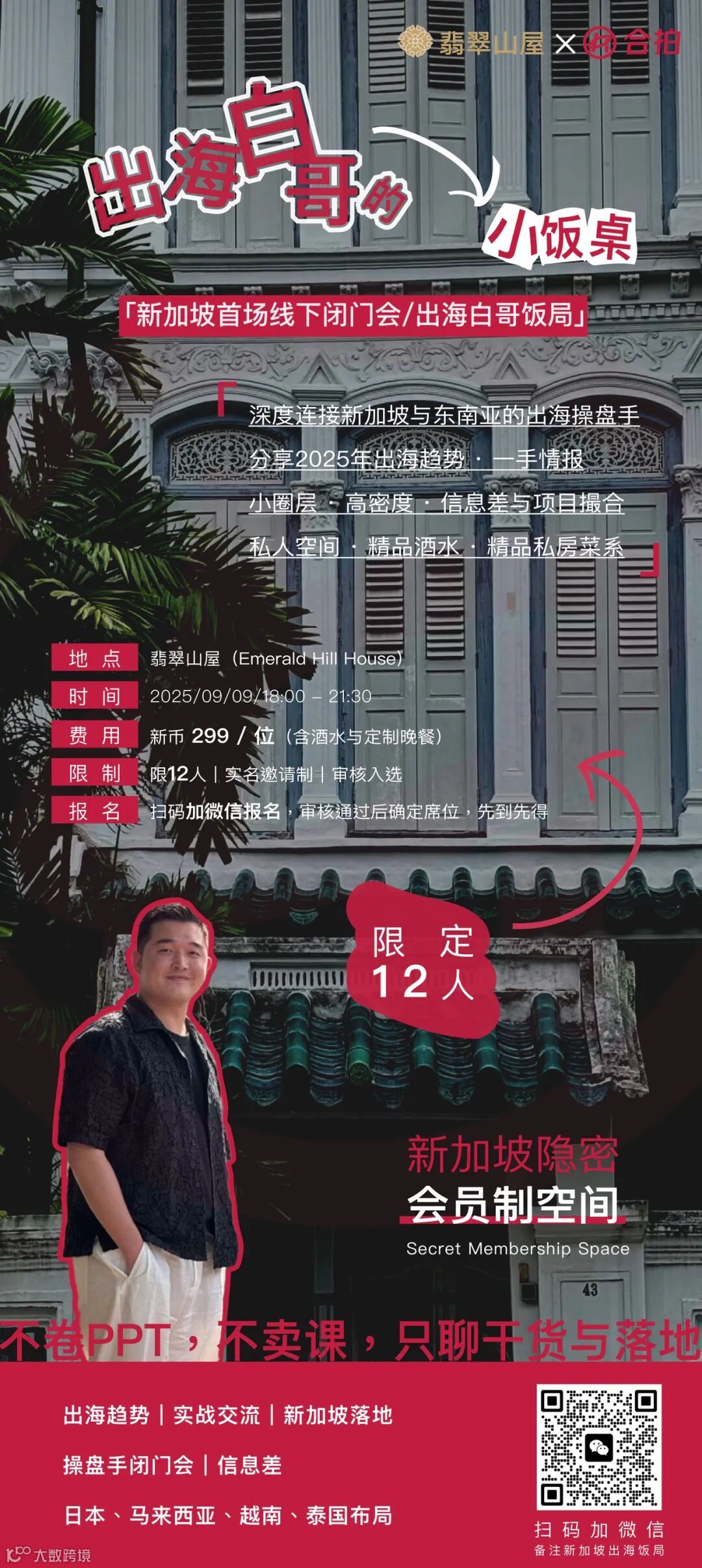 为促进资源对接与信息共享,首场“出海白哥的小饭桌”将于本月9日在新加坡举办。本次活动采用闭门小规模形式,限定12人,集深度交流与聚餐于一体,聚焦新加坡落地经验及东南亚出海项目的实际操作与信息差破解。